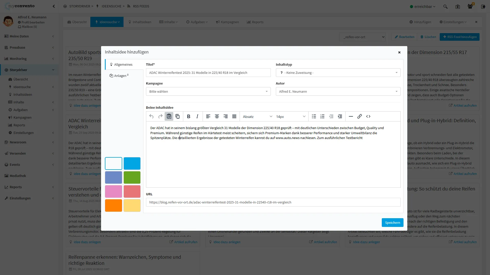 Klicken Sie auf ,,Themenidee dazu anlegen“, wenn Ihnen ein Beitrag gefällt und Inspiration für eine Inhaltsidee liefert. Bearbeiten Sie Ihre Inhaltsidee im Pop-Up Fenster und speichern diese, finden Sie diese unter ,,Inhaltsideen“ aufgelistet.