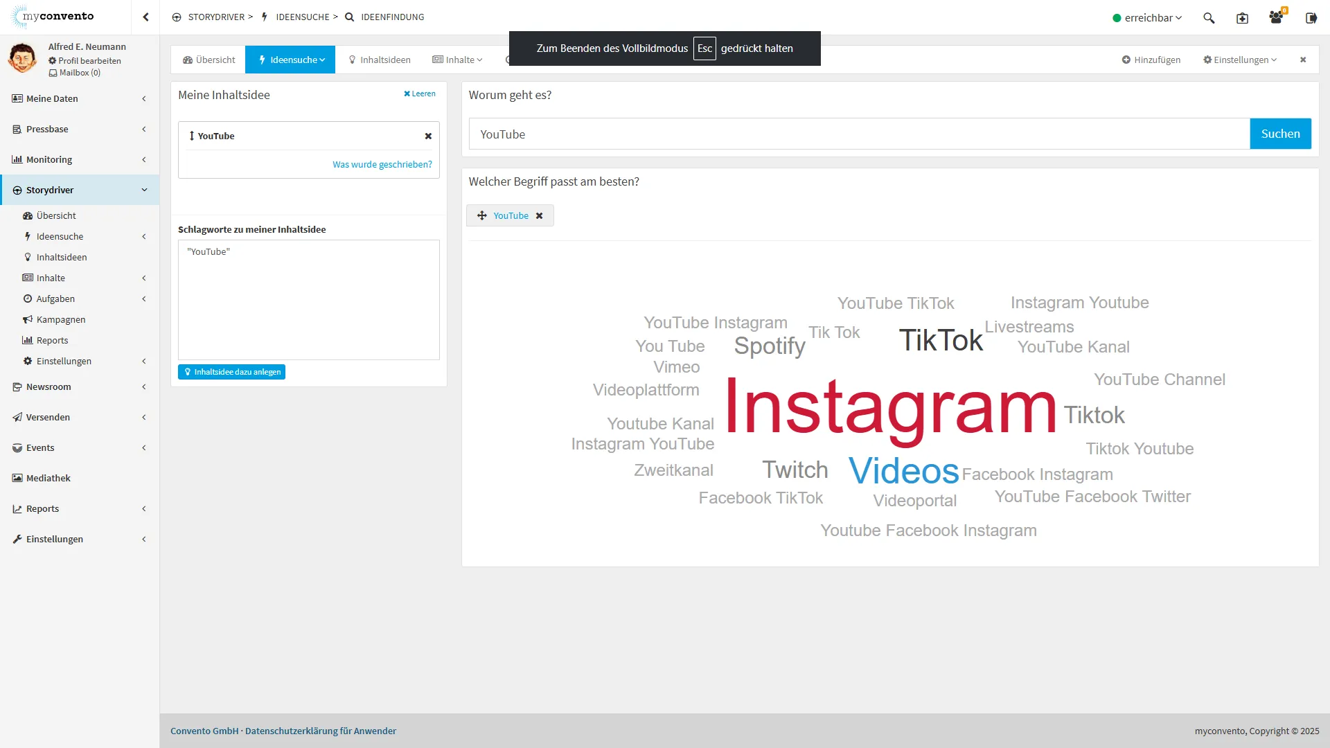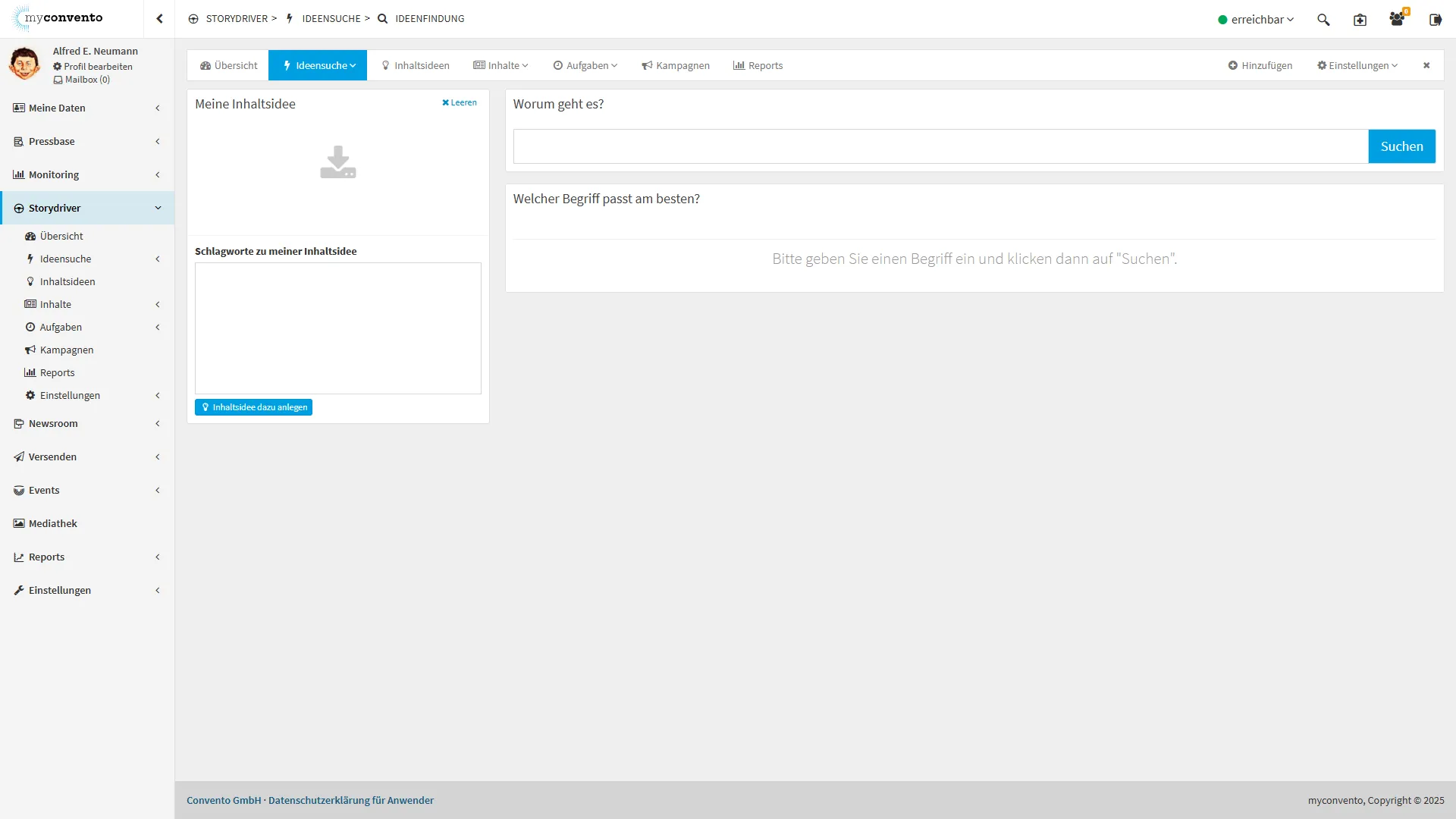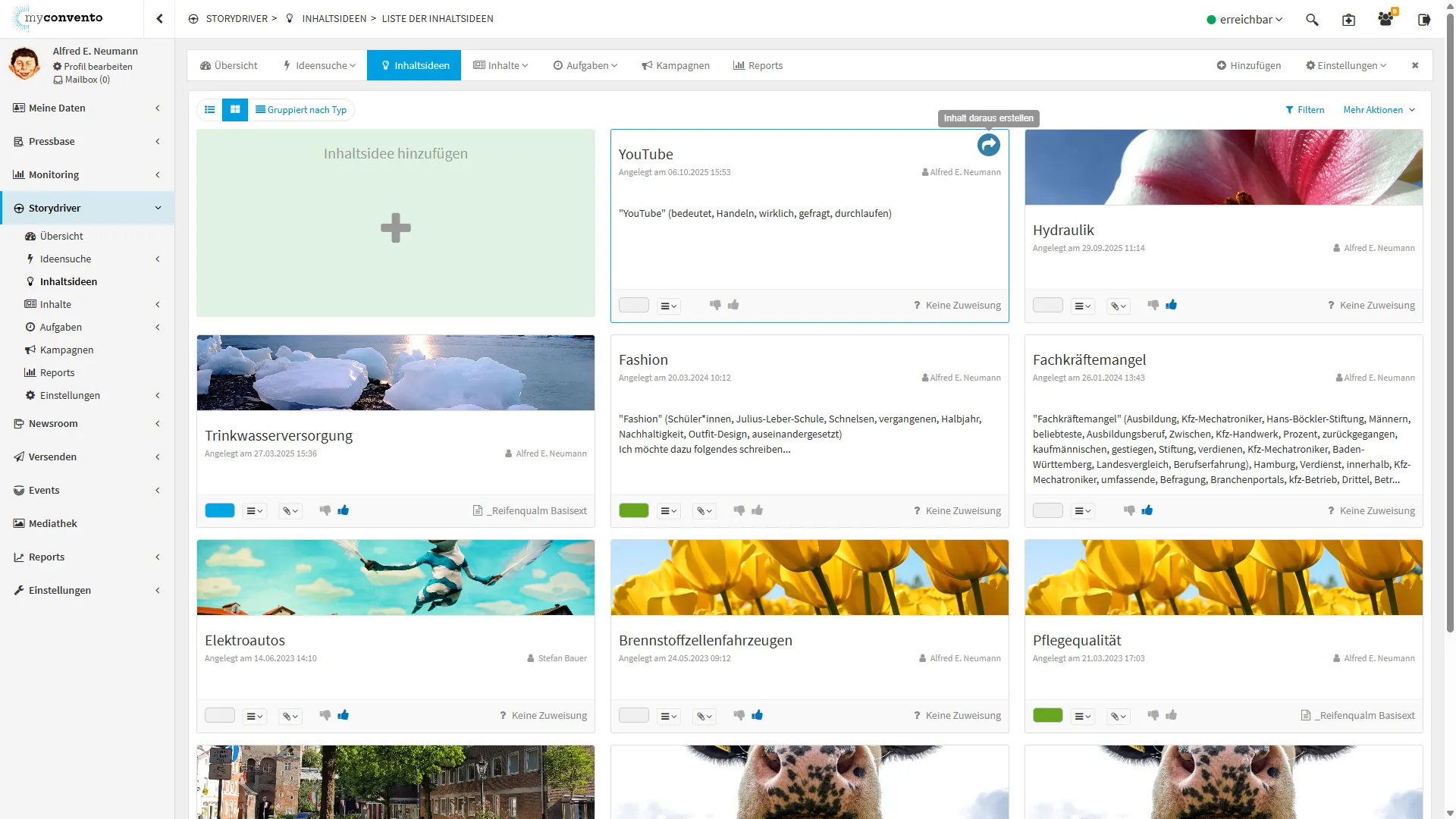 Wenn Sie über die Navigationsleiste auf den StoryDriver und anschließend auf den Reiter „Inhaltsideen“ klicken, gelangen Sie zu folgender Übersicht: